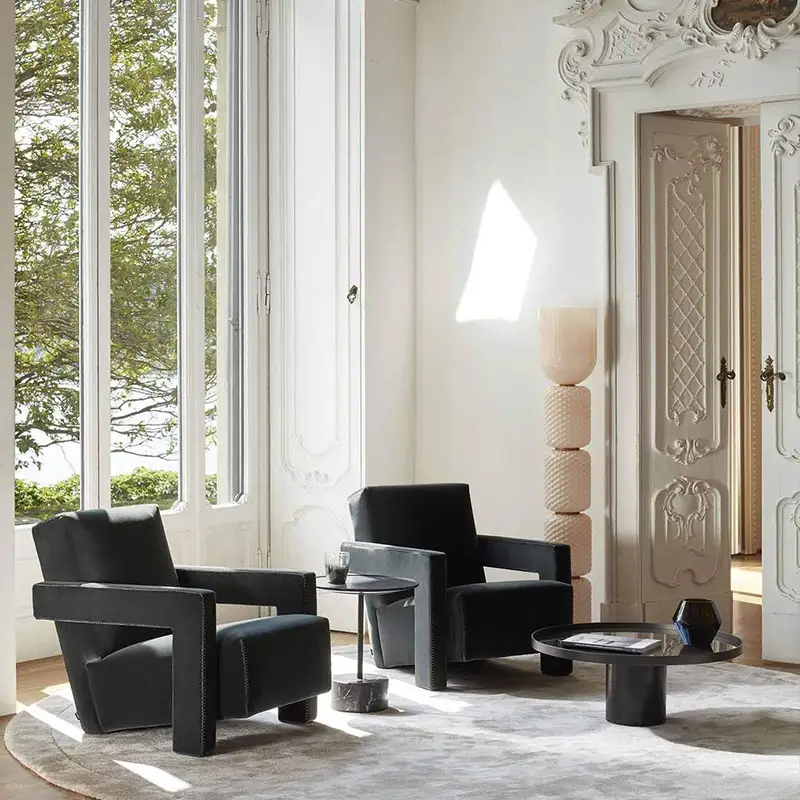Son capitonnage profond contraste avec sa silhouette stricte. Cette tension entre rigueur formelle et confort absolu définit l'approche néoplastique. Disponible en multiples finitions (cuir, tissu Kvadrat), l'Utrecht s'adapte à votre palette chromatique sans jamais perdre son identité.