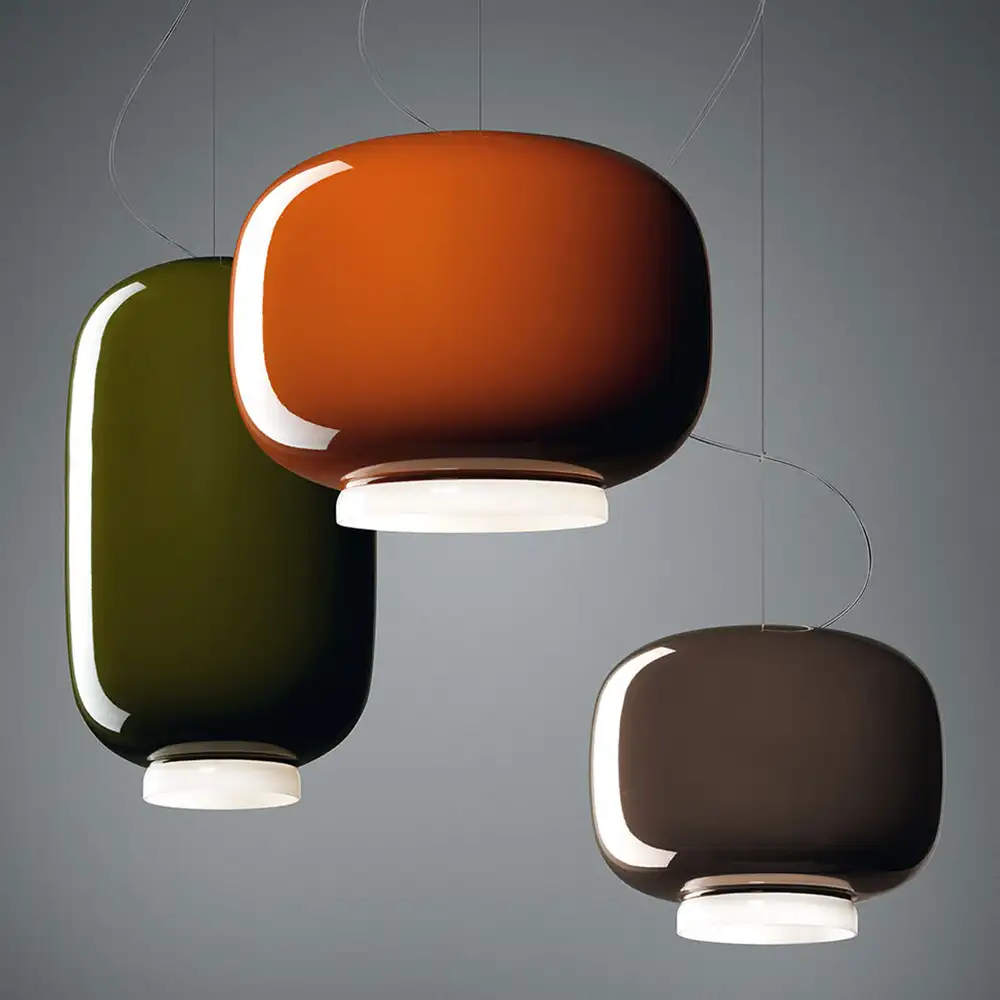 Chouchin transpose la poésie des lanternes japonaises en volumes suspendus de verre laqué. Ses trois tailles permettent des installations en grappe décalée au-dessus d'un îlot central, créant une profondeur visuelle fascinante. La lumière traverse le verre opacifié avec une douceur qui adoucit instantanément les cuisines aux lignes trop angulaires.