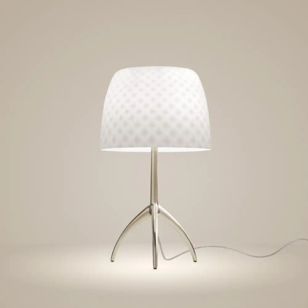 Lumiere, signée Rodolfo Dordoni, incarne l'équilibre parfait entre rigueur architecturale et sensualité du verre. Son trépied en aluminium poli dialogue avec un diffuseur en verre soufflé qui capte la lumière comme un bijou. Posée sur une console en marbre ou un bureau contemporain, elle impose son statut d'icône intemporelle.