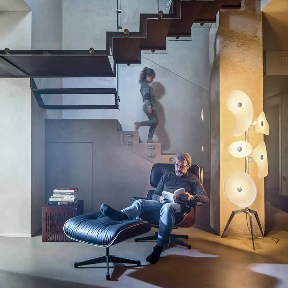 Orbital de Ferruccio Laviani défie toute catégorisation. Est-ce un lampadaire ? Une installation artistique ? Sa structure en anneaux de verre opalin et métal poli évoque autant les planètes d'un système solaire que les bijoux Art déco. Même éteint, il structure un salon ouvert ou une entrée avec la présence d'une sculpture contemporaine. Allumé, il devient un phare doux qui dialogue avec les autres sources lumineuses sans jamais les écraser.