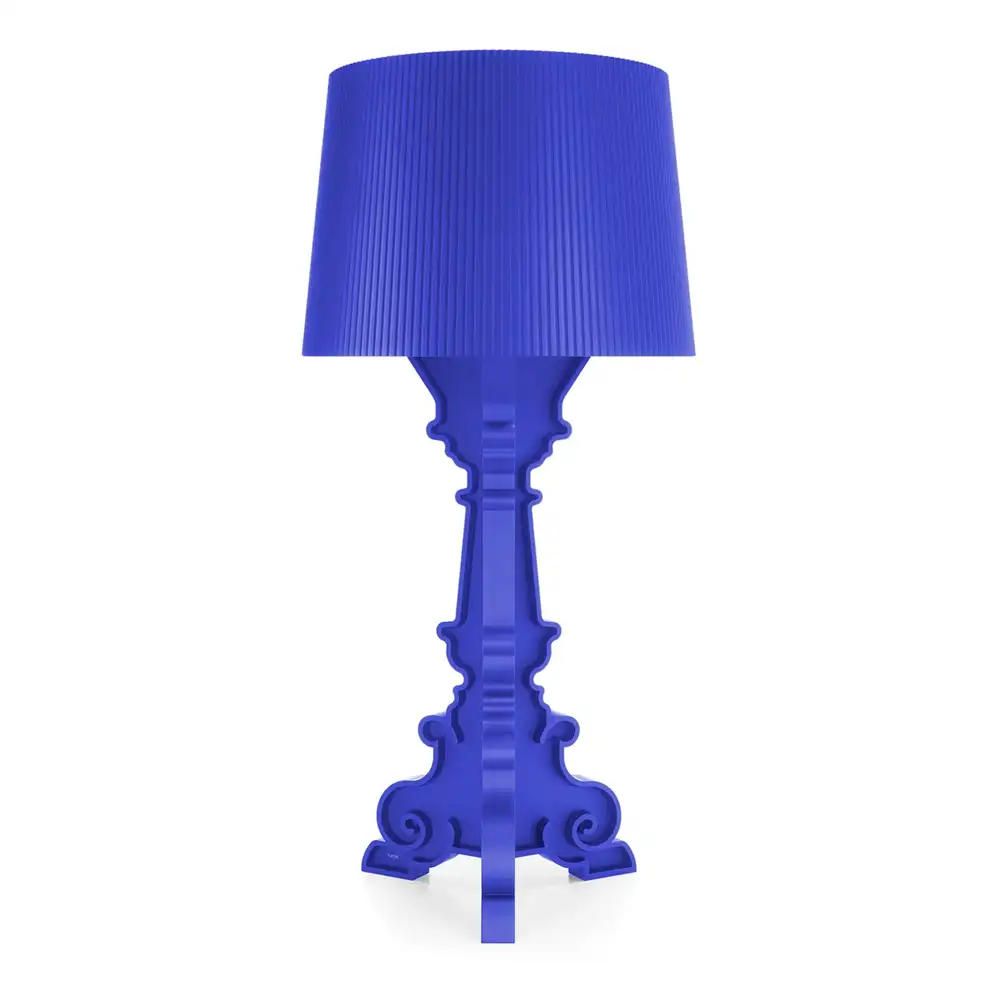 Imaginez un chandelier versaillais qui aurait traversé un accélérateur de particules. Voici Bourgie, la lampe que Ferruccio Laviani a imaginée en 2004 et qui n'a pas pris une ride. Son piètement baroque, avec ses volutes sculptées dans la masse du polycarbonate, supporte un abat-jour plissé qui diffuse une lumière chaleureuse. L'effet est saisissant : l'opulence du XVIIIe siècle rencontre la rigueur contemporaine.