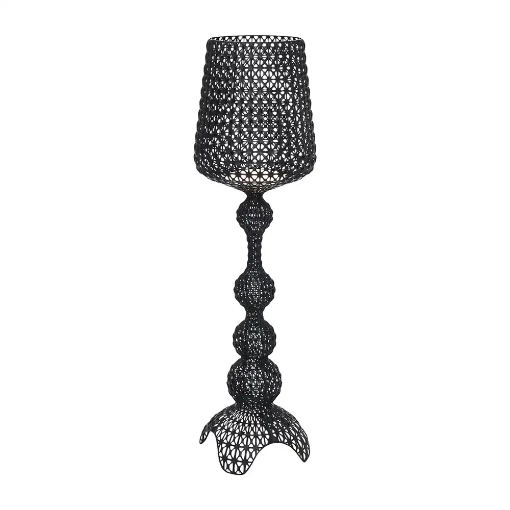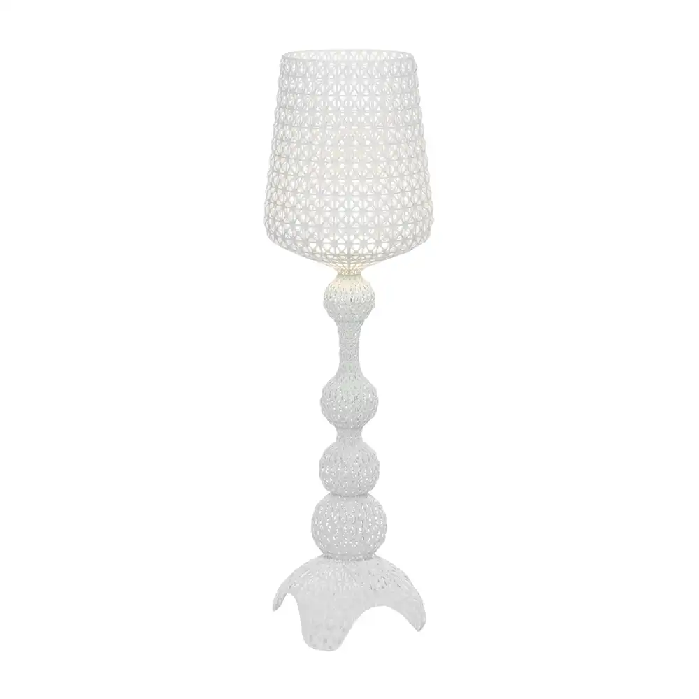 Le lampadaire Kabuki tire son nom du théâtre japonais traditionnel, et cette référence n'est pas anodine. Ferruccio Laviani a utilisé une technique d'injection qui crée une trame ajourée, un réseau de lignes qui évoque la dentelle ou un masque stylisé. Éteint, c'est une présence sculpturale. Allumé, il projette des ombres découpées qui dansent sur les murs.