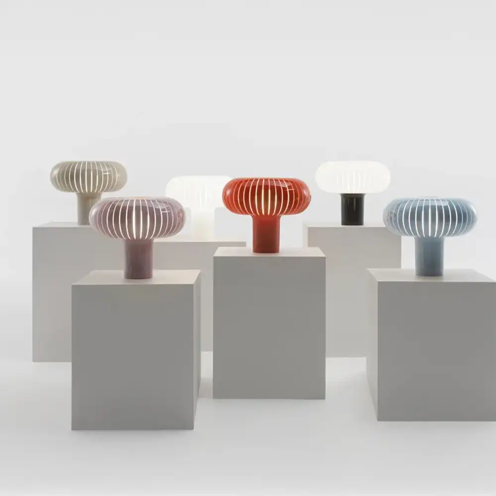 Teresa incarne la sophistication discrète. Ses courbes organiques et son volume généreux créent une présence rassurante. Le polycarbonate fumé, rose poudré ou ambre transforme la lumière en matière presque liquide. C'est cette capacité à filtrer sans étouffer l'éclat qui fait de Teresa une valeur sûre pour les tables de chevet, les buffets de salle à manger ou les bureaux exigeants.