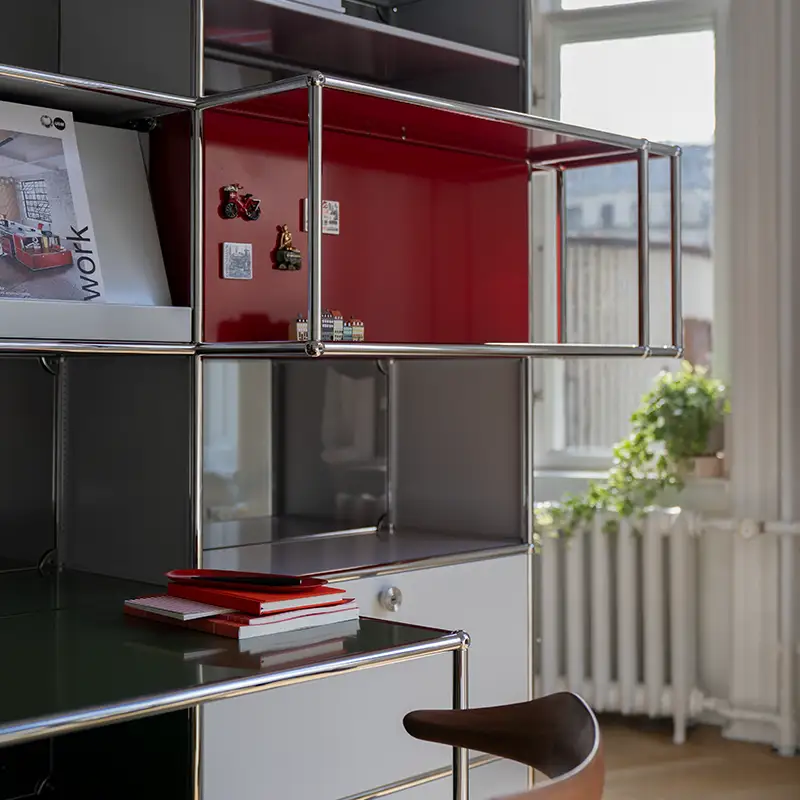 Un site e-commerce vous vendra un "meuble USM 3x2 rouge". Un partenaire local vous vend l'évolutivité d'un système vivant. Votre famille s'agrandit ? Ajoutons une colonne pour créer un dressing dans la chambre parentale. Vous changez de local professionnel ? Démontons votre banque d'accueil actuelle et reconfigurons-la en table de réunion basse avec retour pour votre nouvel open-space.